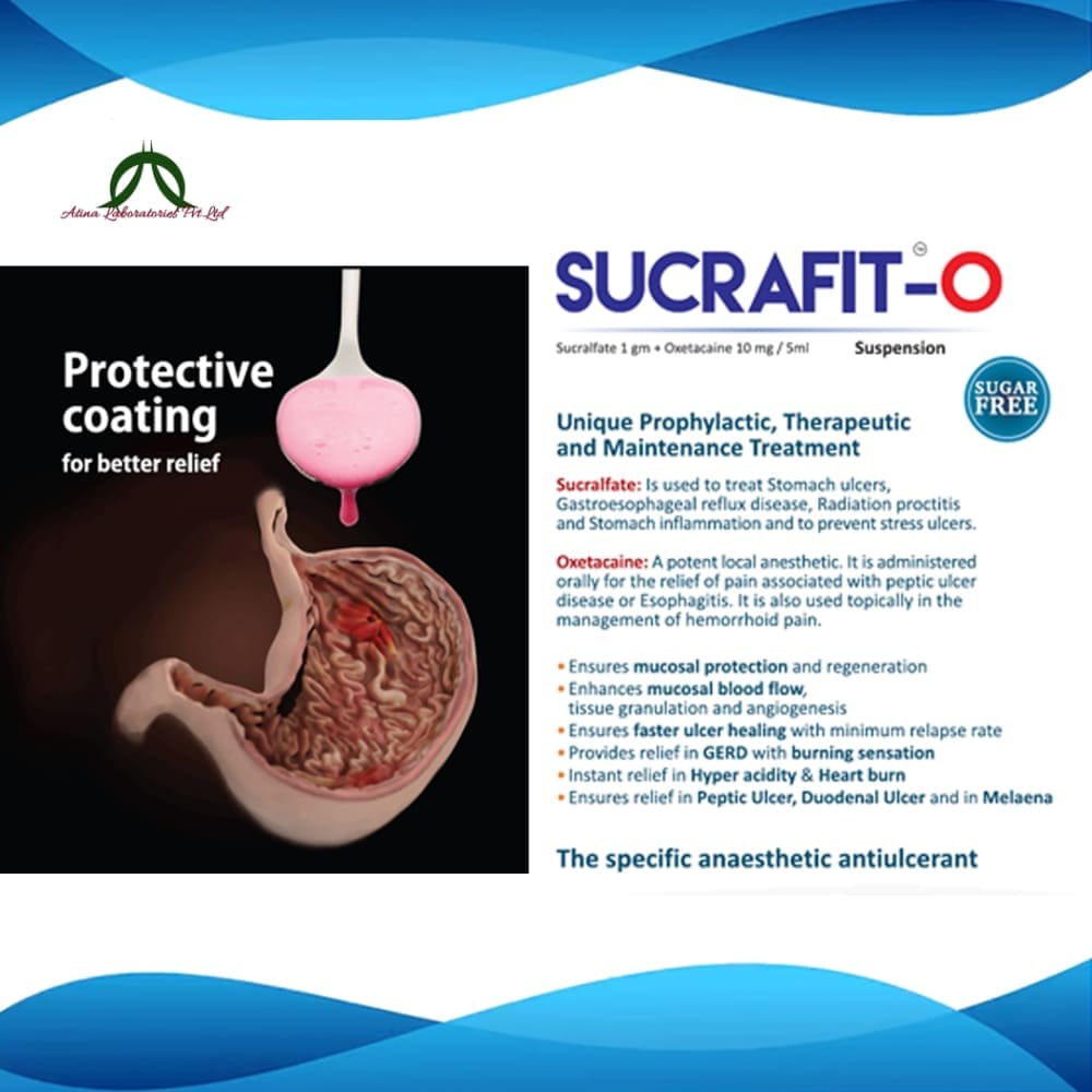 SUCRAFIT-O is a specially formulated anti-ulcer and gastro-protective suspension designed to provide rapid relief from acidity, ulcers, and pain associated with gastrointestinal disturbances. This sugar-free suspension combines the proven mucosal protective power of Sucralfate with the fast pain-relieving action of Oxetacaine, making it a unique prophylactic, therapeutic, and maintenance treatment for multiple gastric conditions.